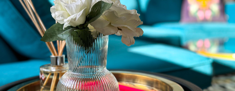 ✅ Other Accessories - A transparent art-deco style vase with artificial white roses, a golden balloon dog ornament, and a golden pineapple table lamp perfectly completed our vision. Finding these pieces wasn't easy, but it was worth the effort!
